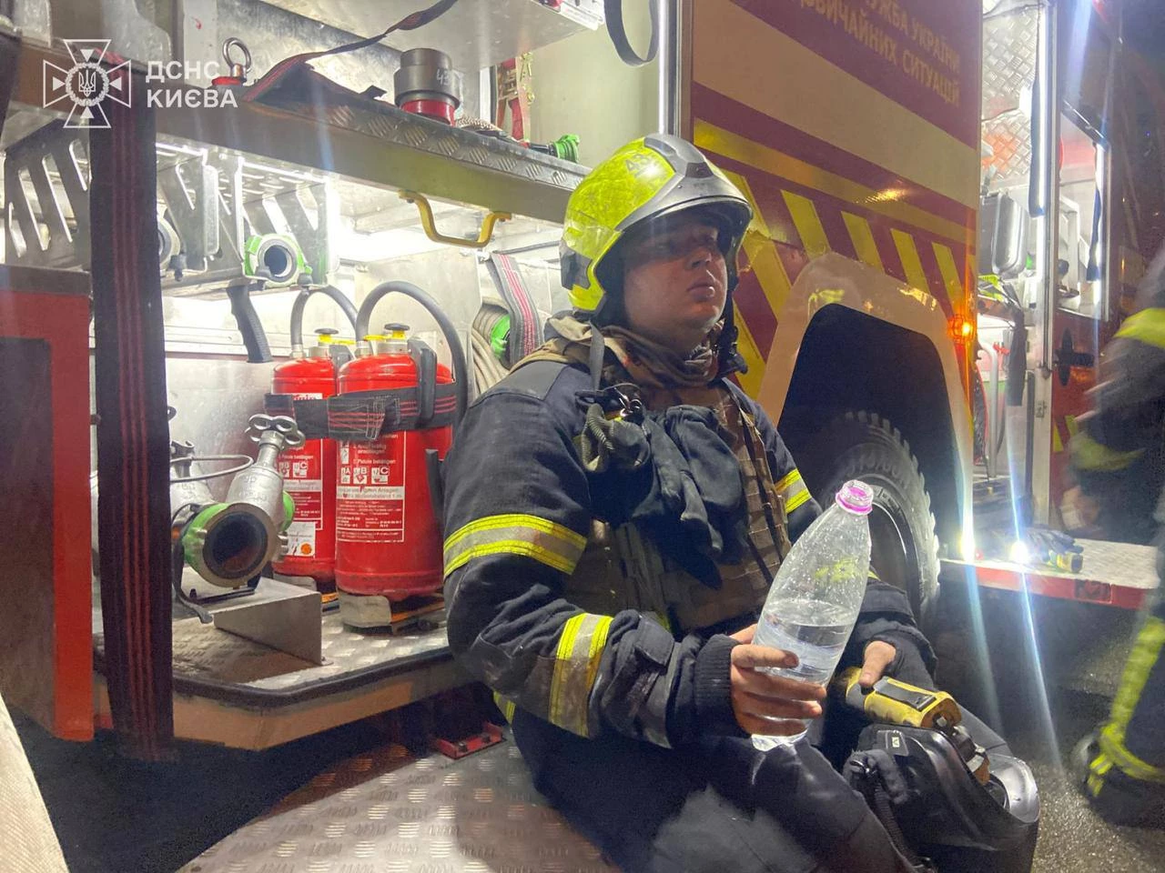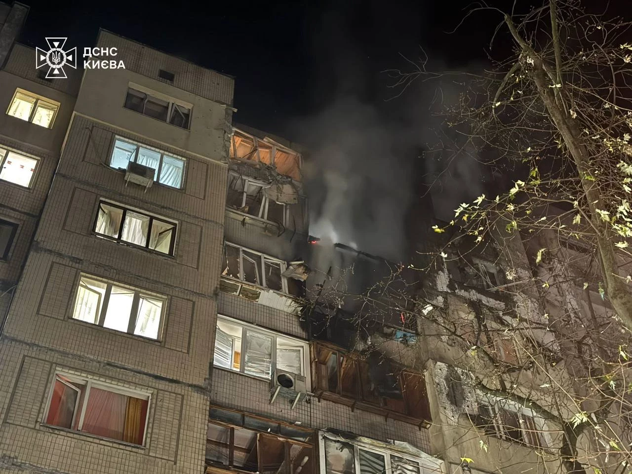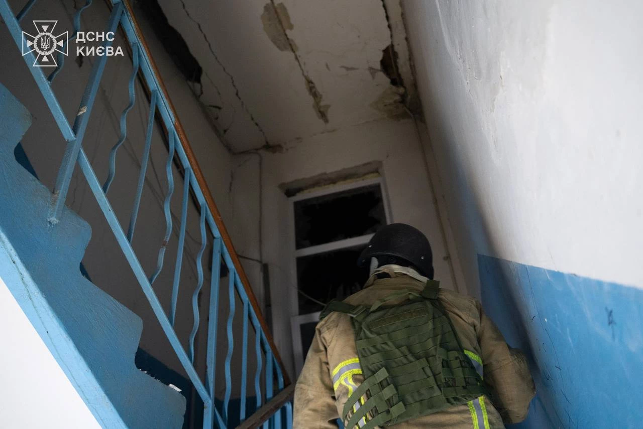 Оболонський район: Влучання у 9-поверховий житловий будинок, виникло загоряння квартир. Одну людину врятовано, пожежу ліквідовано.