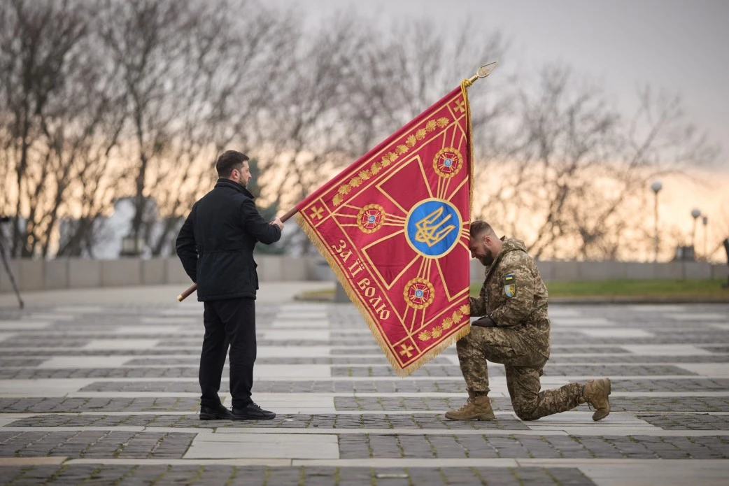 Глава держави вручив бойові прапори командиру 141-ї окремої механізованої бригади, 414-ї окремої бригади безпілотних систем «Птахи Мадяра», 425-го окремого штурмового полку «Скеля» та 108-го окремого штурмового батальйону «Вовки Да Вінчі» 59-ї окремої штурмової бригади безпілотних систем імені Якова Гандзюка.