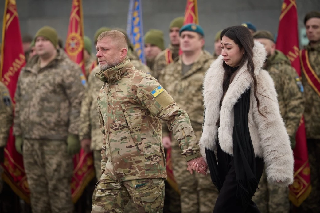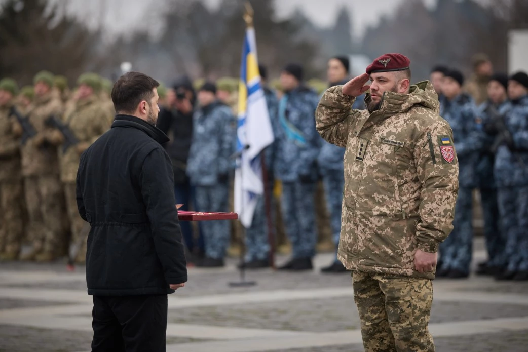 Також президент вручив командиру 42-ї окремої механізованої бригади стрічку почесного найменування «імені Героя України Валерія Гудзя».